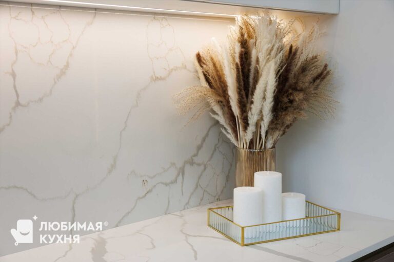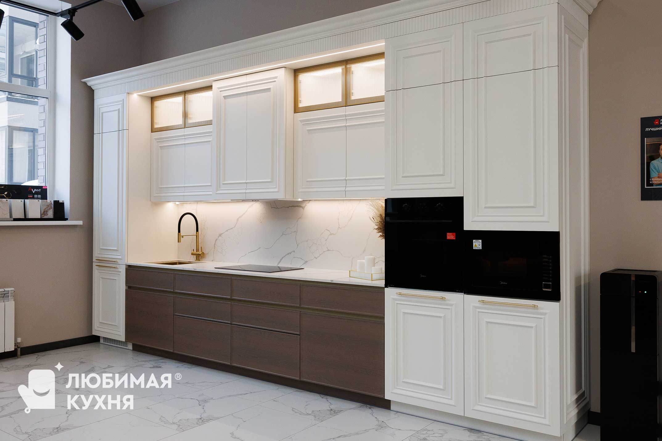 Нижние шкафы выполнены в оттенке темного дерева, что создаёт стильный контраст и балансирует классический верх современным низом. Лаконичные горизонтальные ручки поддерживают минималистичный настрой. Фартук и столешница с выразительной, но ненавязчивой текстурой светлого мрамора, объединяя всю композицию.
