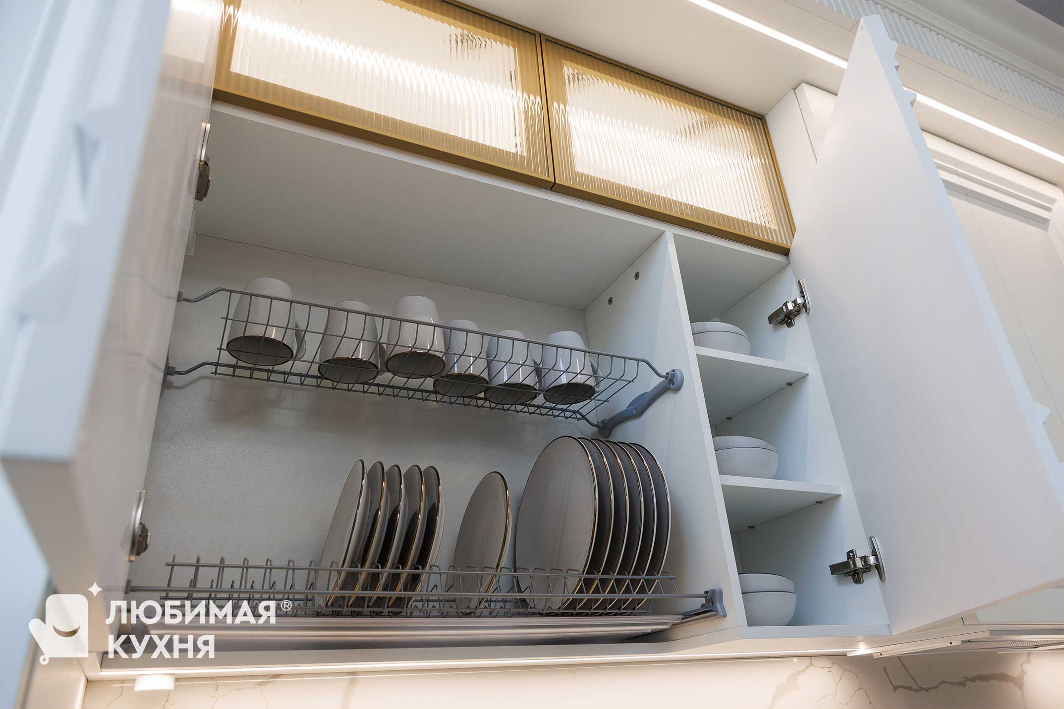 Светлые фасады с классической фрезеровкой, доходящими до потолка, визуально увеличивают высоту помещения и создают ощущение цельного архитектурного объёма. Витринные вставки с подсветкой добавляют лёгкости и декоративности. Карниз и вертикальные панели подчёркивают классический характер композиции.