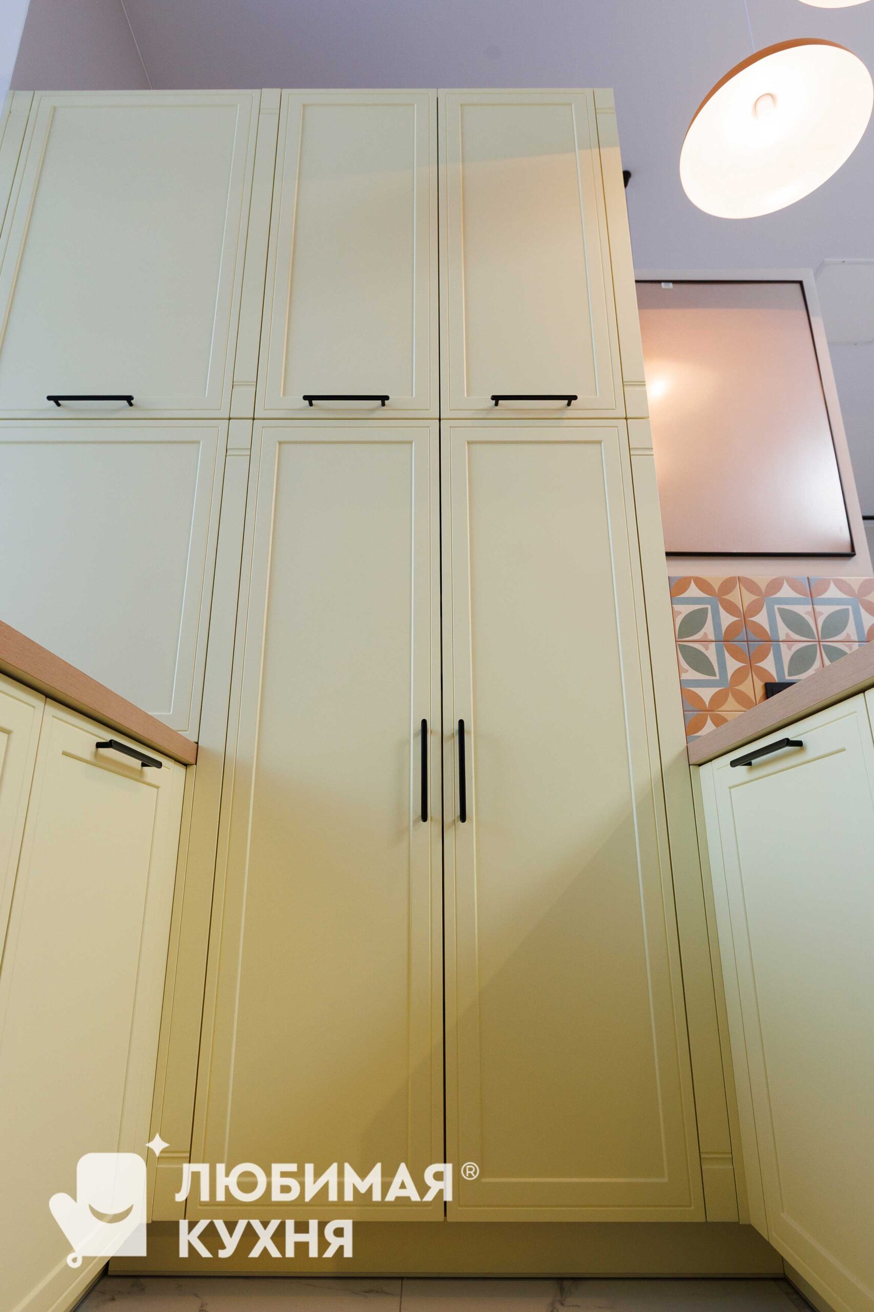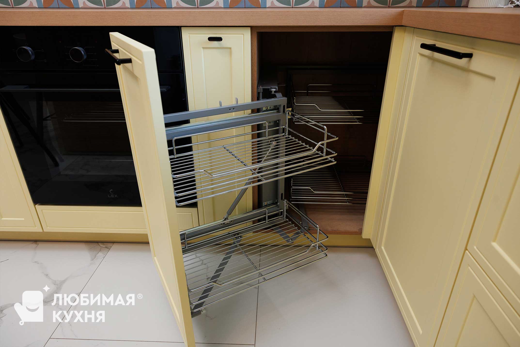 Уютная кухня в скандинавском стиле с фасадами нежно-лимонного оттенка. Фартук из цементной плитки с геометрическим орнаментом в терракотовых и оливковых тонах добавляет характер пространству. Функциональный остров из ЛДСП с текстурой дуба со встроенной розеткой служит обеденной зоной. Очень милая кухня, которая прекрасно впишется в интерьер квартиры и загородного дома.
