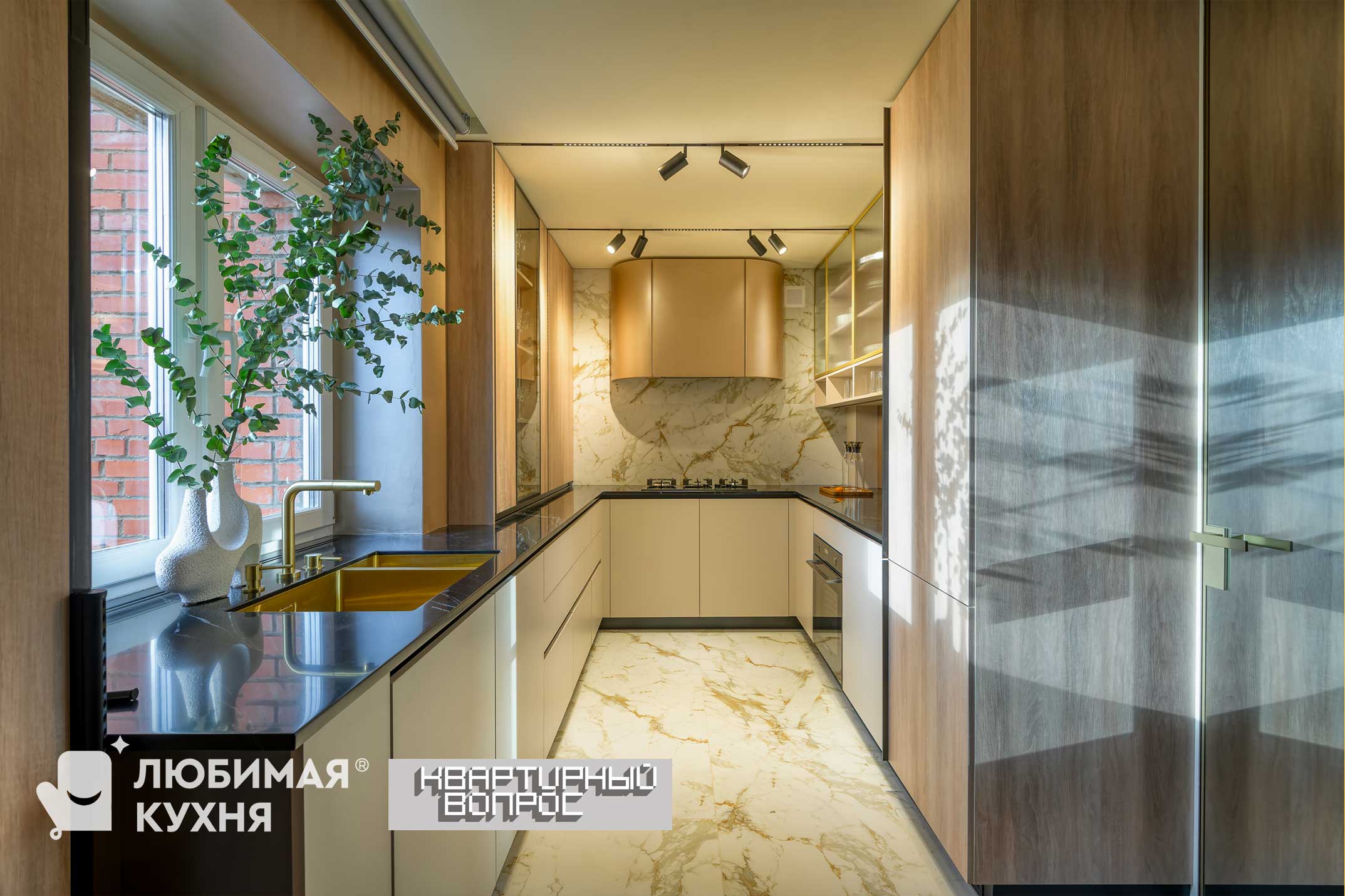 Масштабная переделка — затронула кухню, гостиную и коридор. В результате появилось единое пространство, в котором будет кухня станет удобнее и просторнее, а в гостиной – место для полноценной двуспальной кровати. Помогут нам в этом знание математики и архитектурное образование, немного магии и основательная работа со стенами и дверными проемами. А объединит комнату бежевый цвет, компанию которому составят мягкие полутона и контрастные акценты черного и белого цветов.
