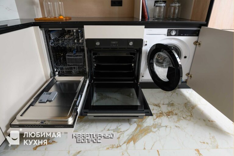 Часть нижних баз на кухне глубиной 40 см. Это позволит сэкономить пространство и уместить всю технику. Корпуса элементов – из ламинированной ДСП с пластиковой кромкой. Она надежно защищает от повреждений. Для тумб в качестве ручек используем удобный профиль Gola. Ящики гарнитура –полного выдвижения, с доводчиками. Распашные дверцы – с петлями легкого монтажа.
