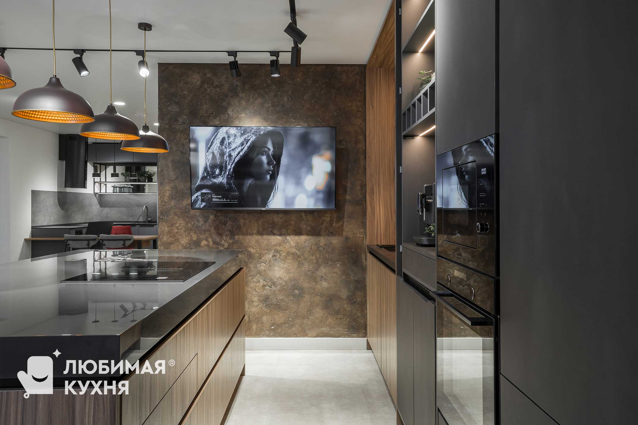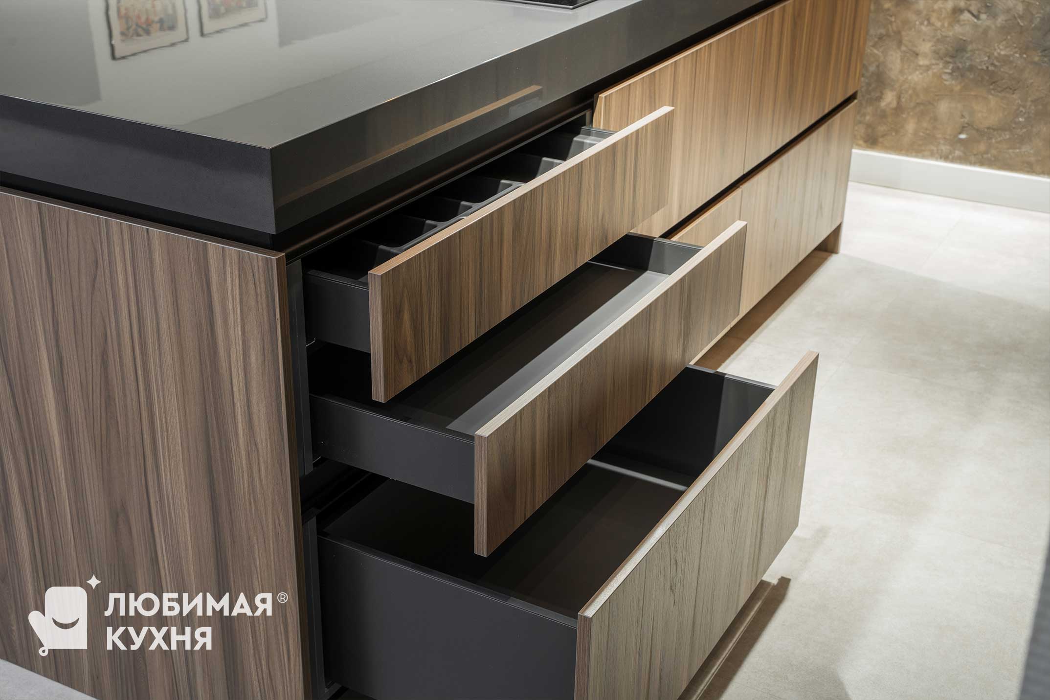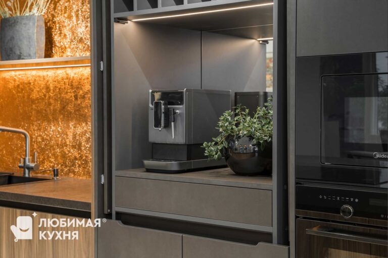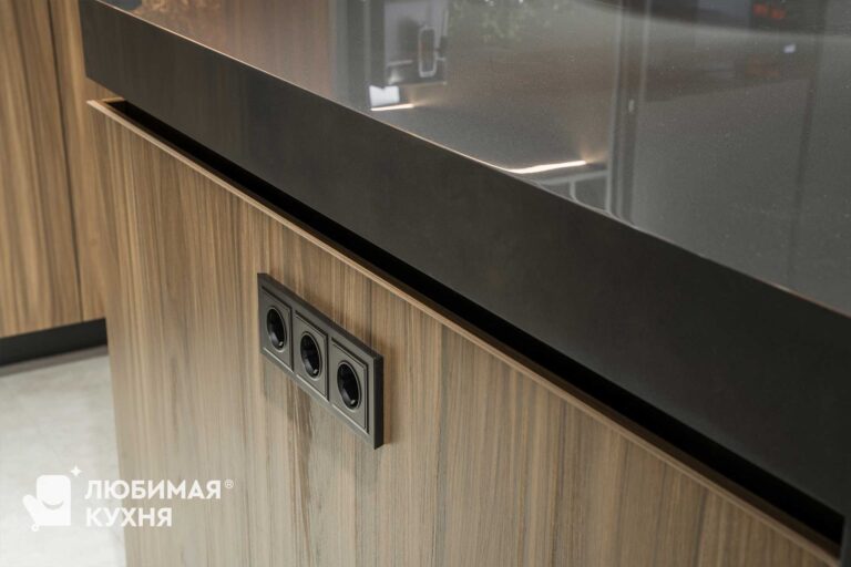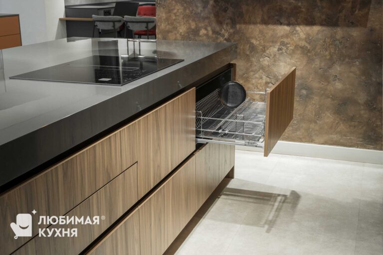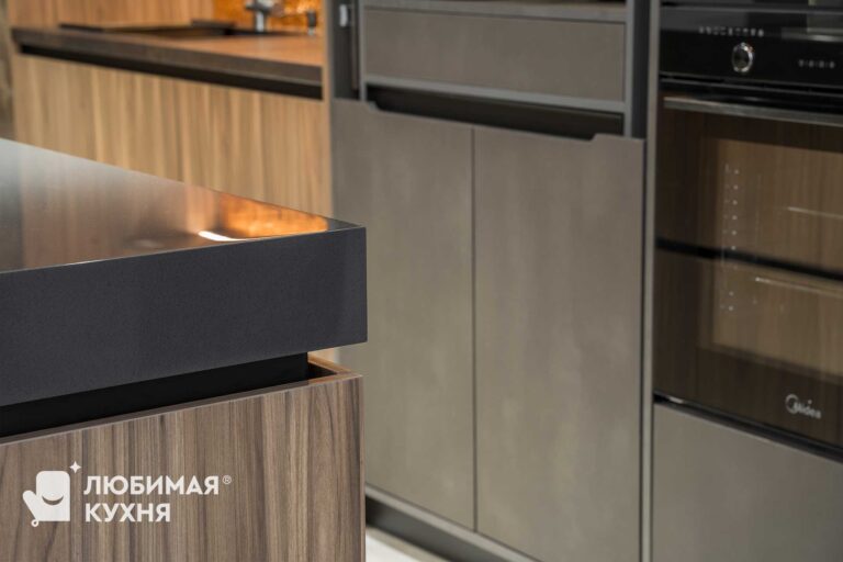 Шикарная кухня для ценителей сложных текстур, цветовых сочетаний и внимательных к деталям. Небольшая зона с мойкой, совмещенная с невероятно вместительными пеналами, в которых разместились полки для хранения различной утвари, от кофемашины, до столовых приборов и колонны со встроенной техникой. Композицию завершает большой и вместительный остров, с одной стороны которого предусмотрена зона готовки с варочной панелью, а с другой зона приема пищи и отдыха.