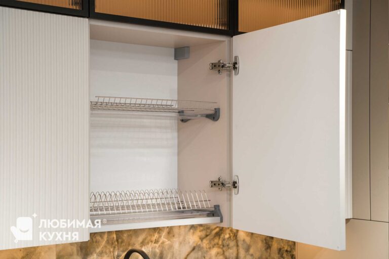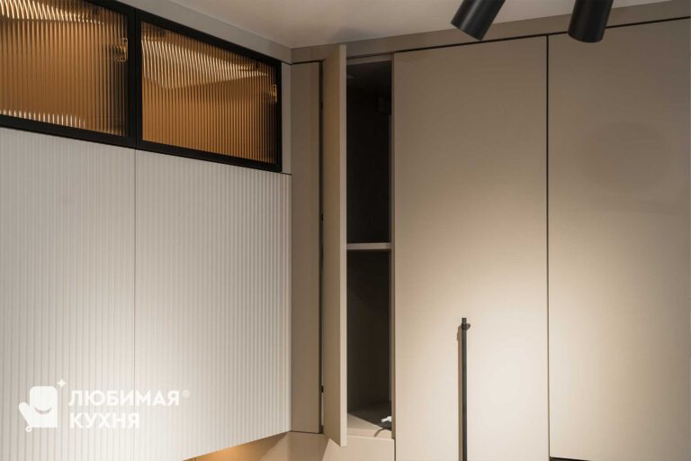 Кухня бестселлер! В ней идеально все — бежево-серые фасады, черная алюминиевая рамка со стеклом, рифленые фасады — кухня мечта! Удачная компоновка обеспечивает легкий доступ ко всему необходимому, благодаря чему готовка превращается в одно удовольствие. Сдержанная палитра цветов и матовые фасады обеспечит легкость в уборке и сдержанность, алюминиевые рамки создадут акцент и придадут легкость конструкции!