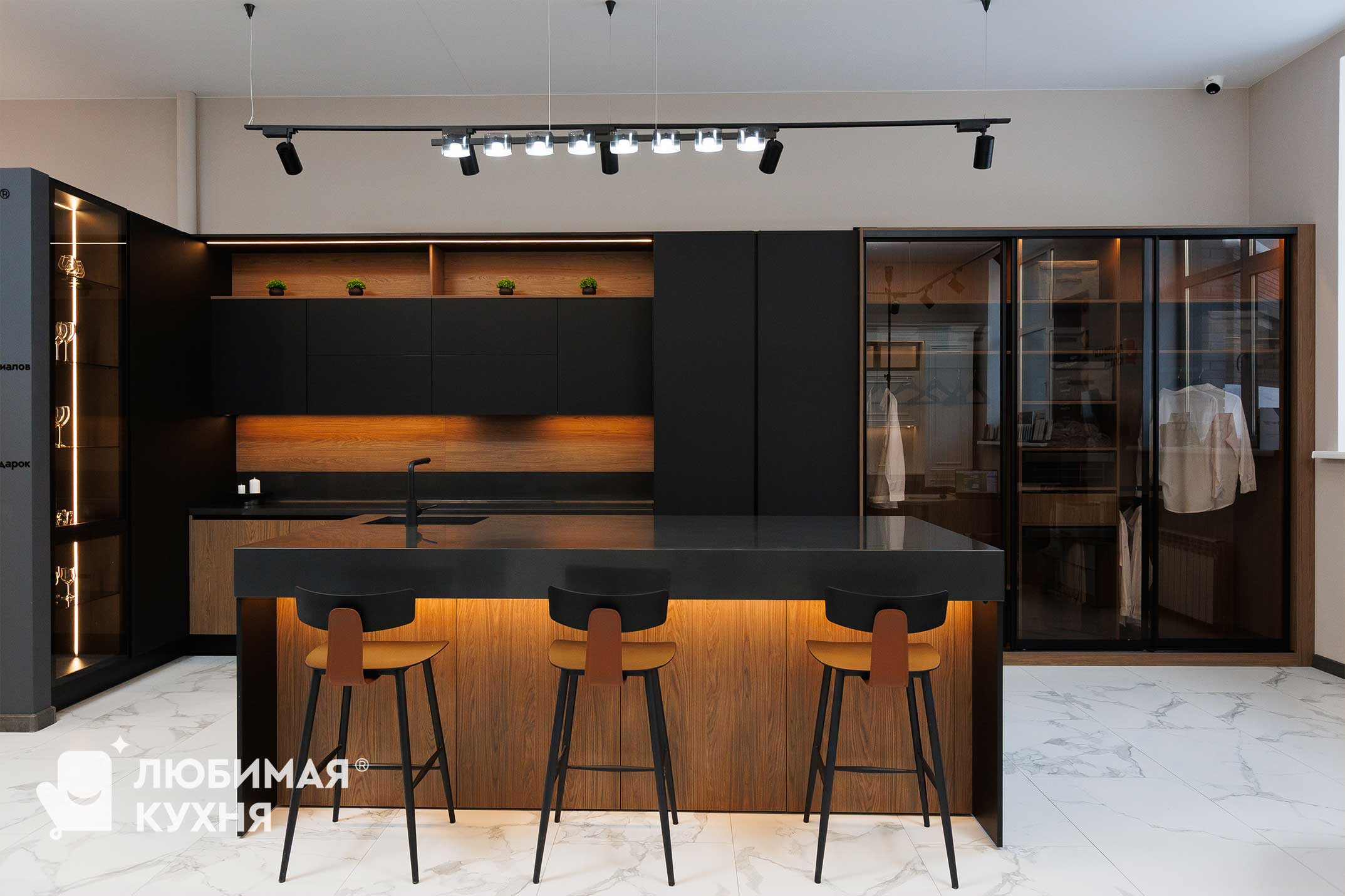 Кухня выполнена в современном минималистичном стиле с акцентом на контраст фактур и света. Матовые тёмные фасады сочетаются с тёплым древесным оттенком, создавая уютную и статусную атмосферу. Открытые ниши с декоративной подсветкой добавляют глубину и визуальную динамику, подчёркивая архитектурность композиции. Лаконичные формы и скрытые ручки делают интерьер строгим, стильным и функциональным.