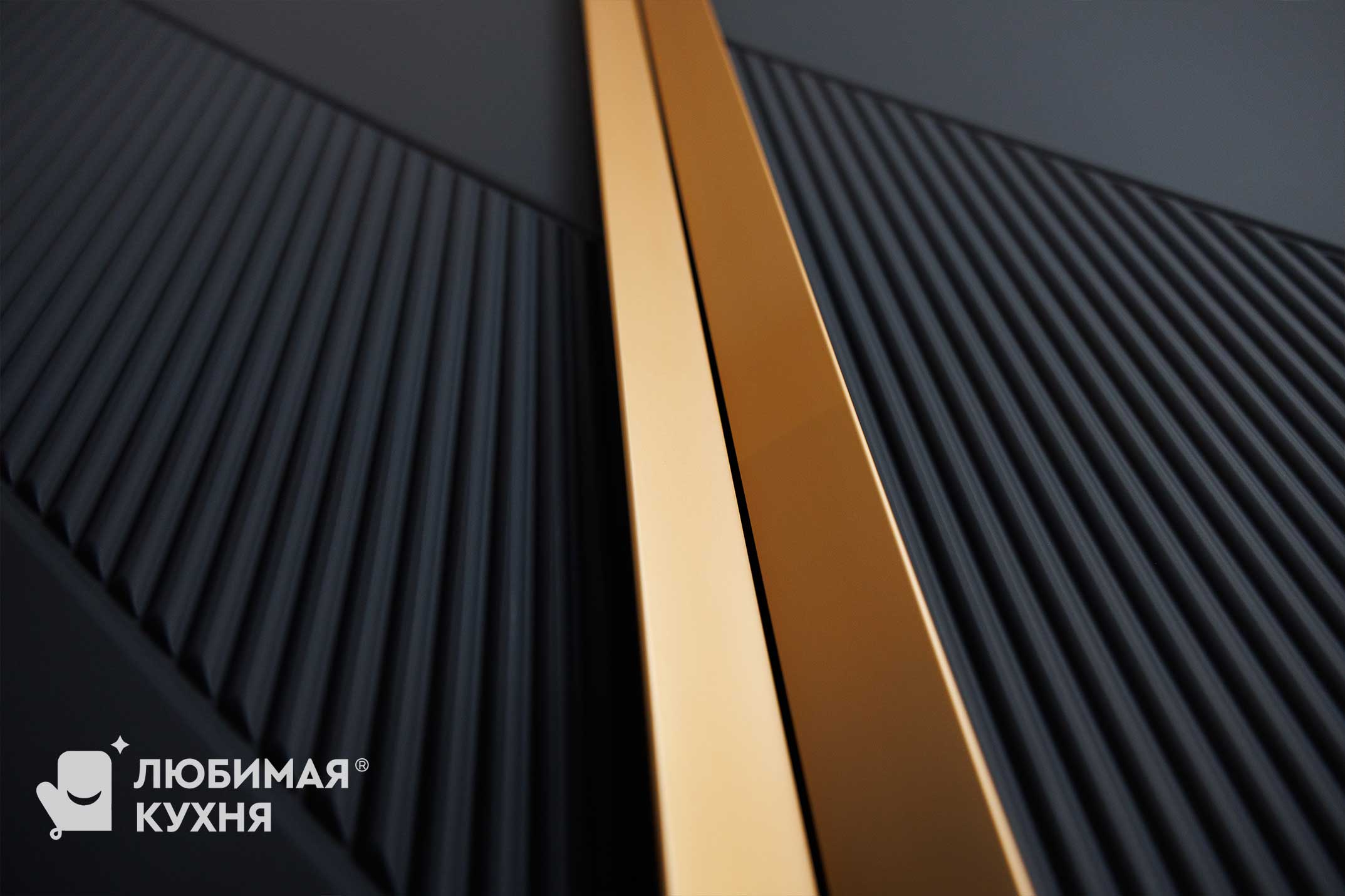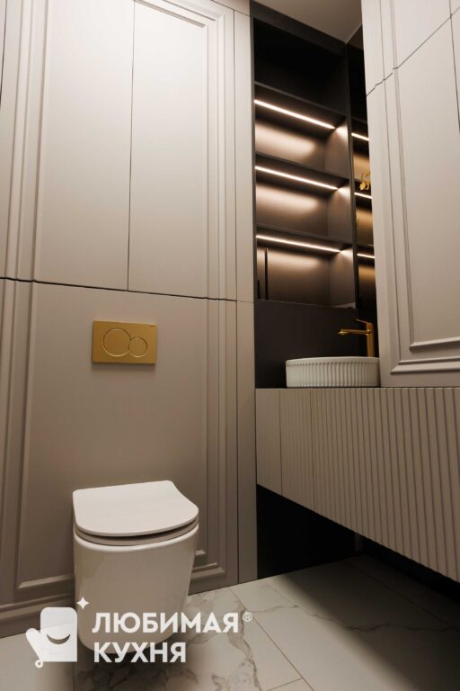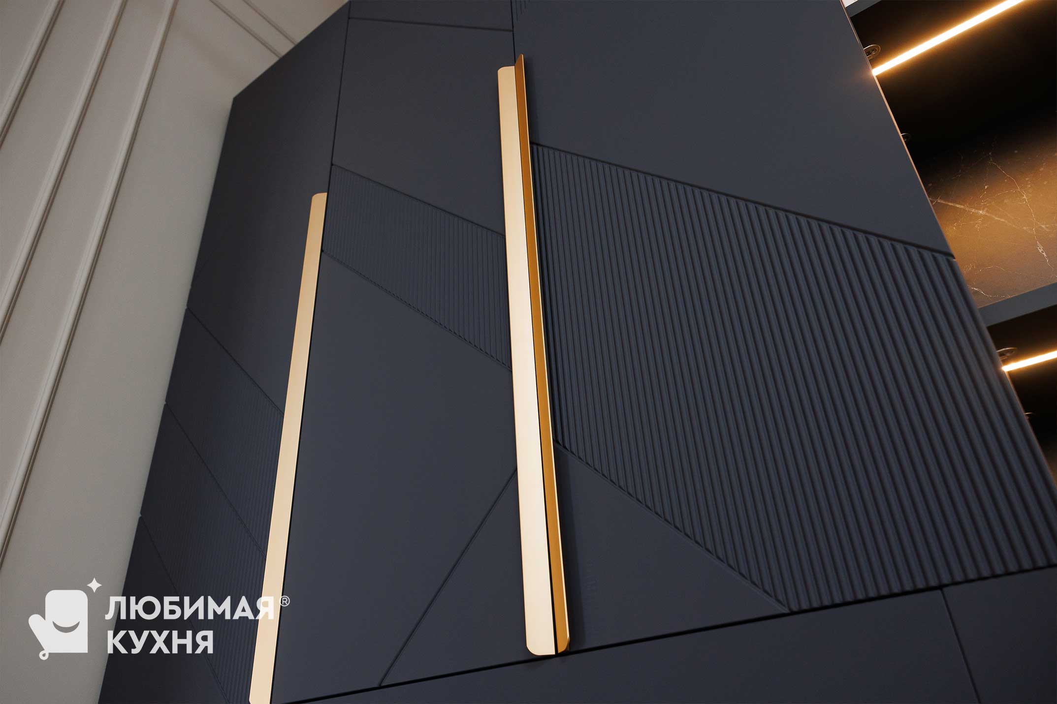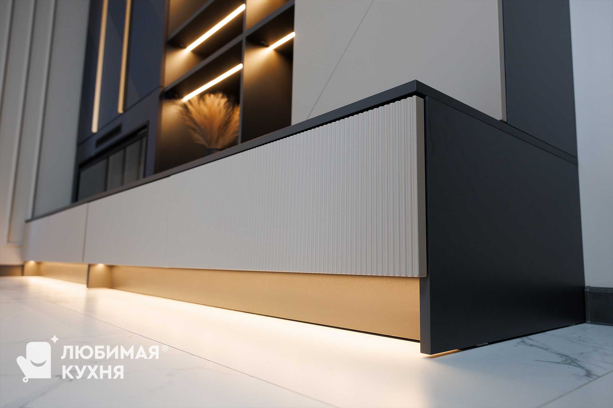 Гостиную в современном стиле с контрастным сочетанием графитового и бежевого оттенков. Фасады шкафов украшены геометрической фрезеровкой и длинными золотистыми ручками. Открытые полки с текстурой мрамора и тёплой подсветкой создают эффектную экспозицию для декора и книг. Встроенный электрокамин с эффектом живого пламени добавляет уюта, а рифленые фасады нижних тумб с подсветкой усиливают ощущение лёгкости. Идеальное решение для хранения и создания атмосферы в современном интерьере.