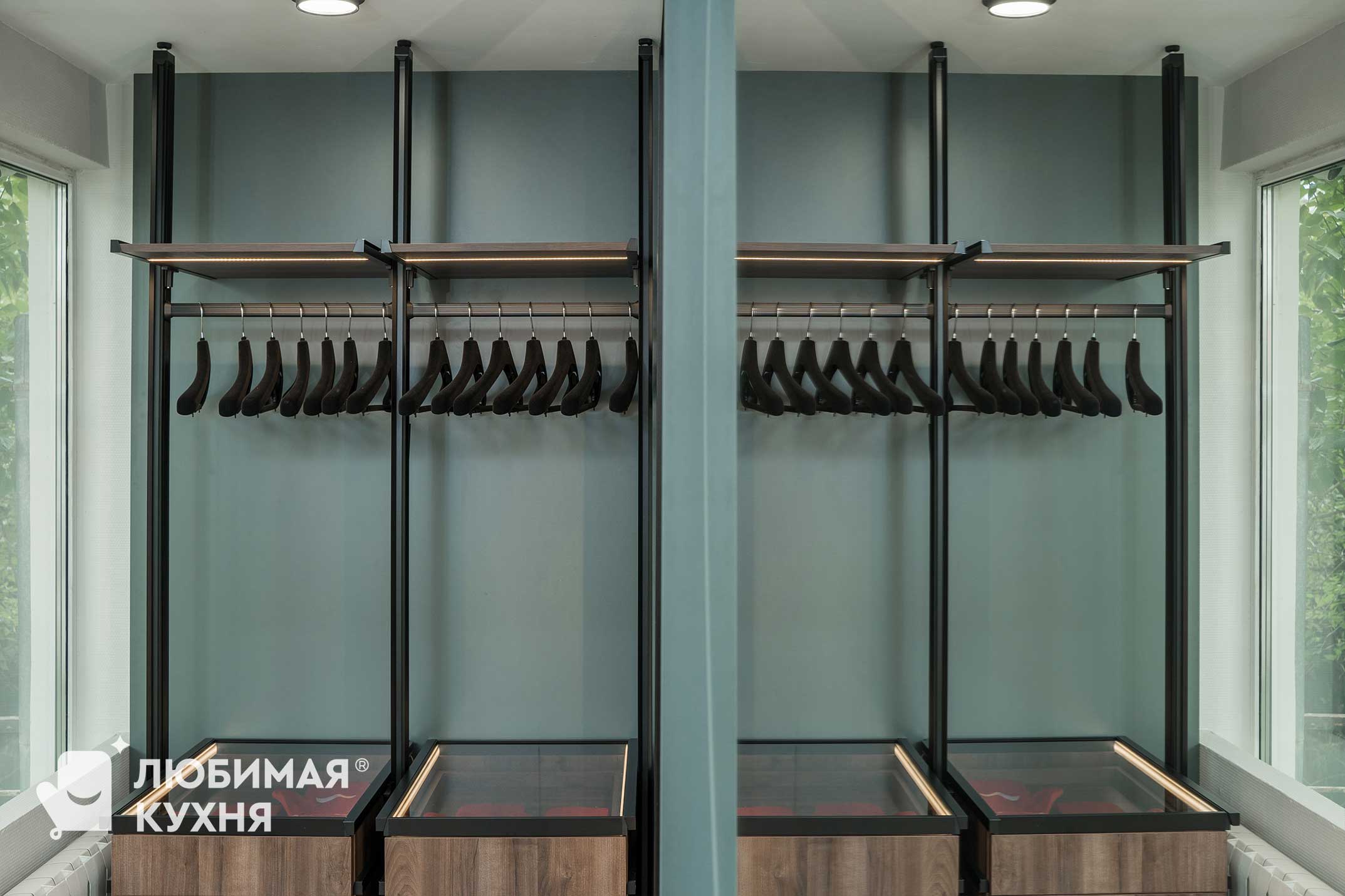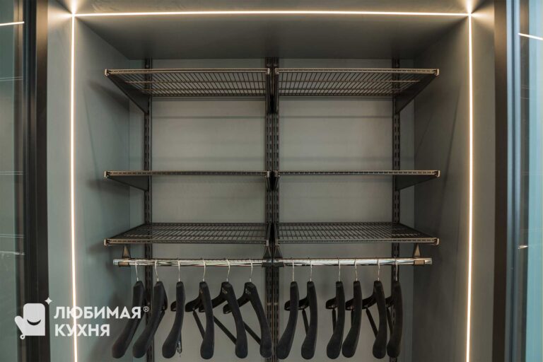 Внутренне наполнение: гардеробная система Аристо, полки с подсветкой, стекло прозрачное