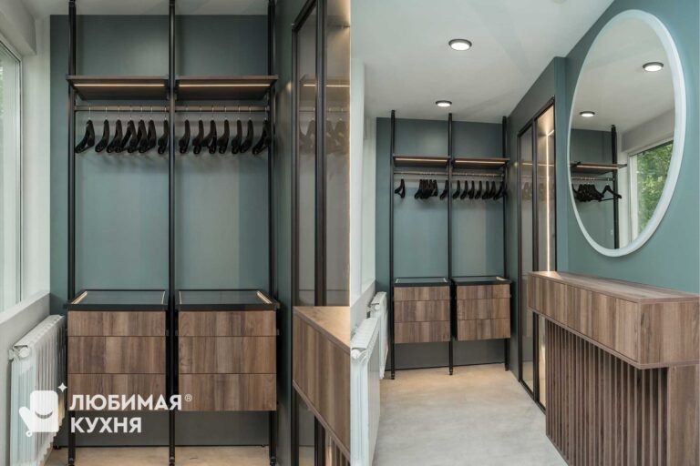 Стильная гардеробная, невероятно вместительная и продуманная до мелочей. В полках предусмотрена подсветка, для отличного обзора вещей даже без основного освещения. Системы хранения — полки,ящики,сетки, все продумано для комфортного расположения различных вещей вашего гардероба.