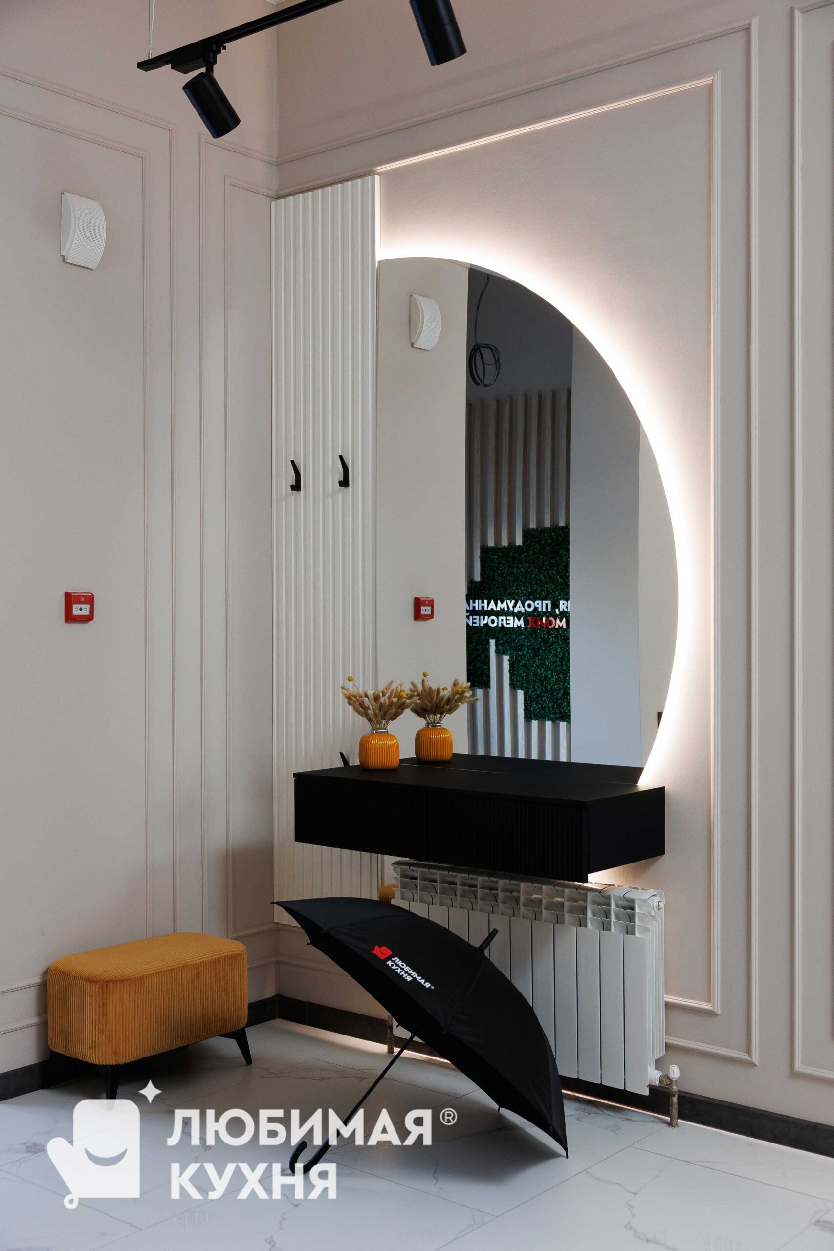 Стильная зона для прихожей в современном минималистичном дизайне. Подвесная консоль чёрного цвета с рифленым фасадом эффектно контрастирует со светлыми стенами и создаёт лёгкое ощущение парения. Рифленая стеновая панель и круглое зеркало с мягкой подсветкой по периметру визуально расширяет пространство и добавляет уюта, создавая функциональную и эстетичную входную зону.